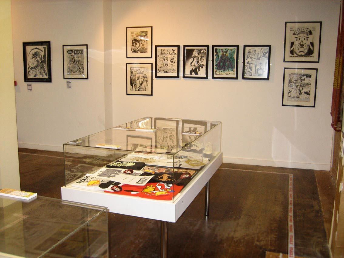 One of the Display Cabinets, with Original Art by Ron Smith, Carlos Ezquerra, Cam Kennedy, Robin Smith and Cliff Robinson, along with a pile of old 2000AD Merchandise!