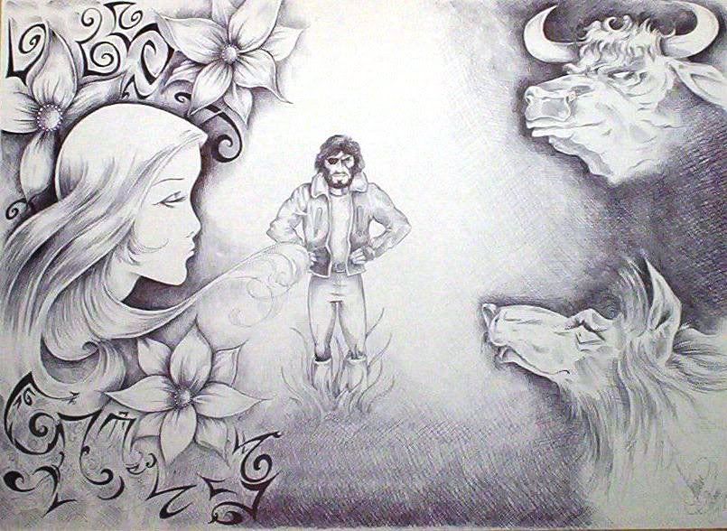 I'm an ignoramous when it comes to critiquing (sp?) art, but - I think the girl and the flowers and the patterns all look fantastic - the wolf and the bull are okay (but rough in comparison) and Stone looks wonky - out of proportion.