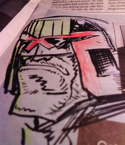 Fab little challenge. I'd normally not take part in these sorts of 'board' drawing activities, but this was just the right kind of warm-up task to get the creative juices flowing! No idea whose Dredd this is reminiscent of though.
