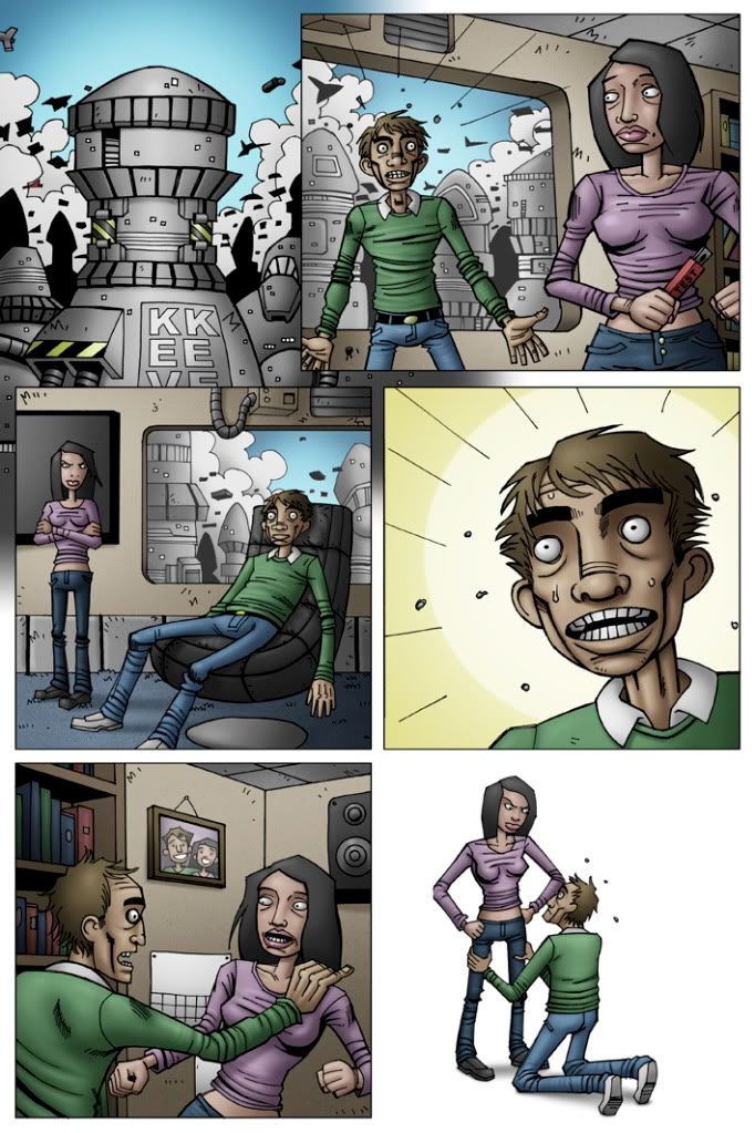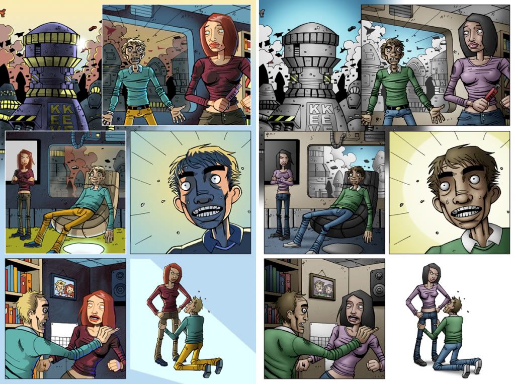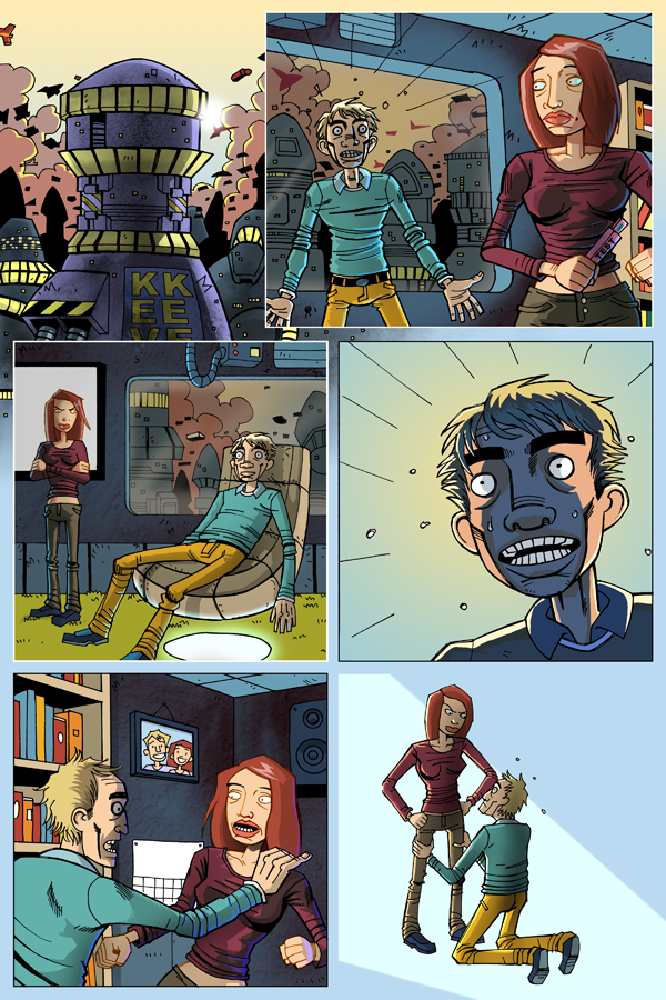 Wow - it's very strange feeling seeing how someone else colour your work! Really like what you did with panel 4 - different to how I'd imagined but really adds something. The glowing hover chair is a nice touch too. I like the dusk effect on the sky and clouds in the first panel - again, not how I'd have done it but gives a really nice mood.