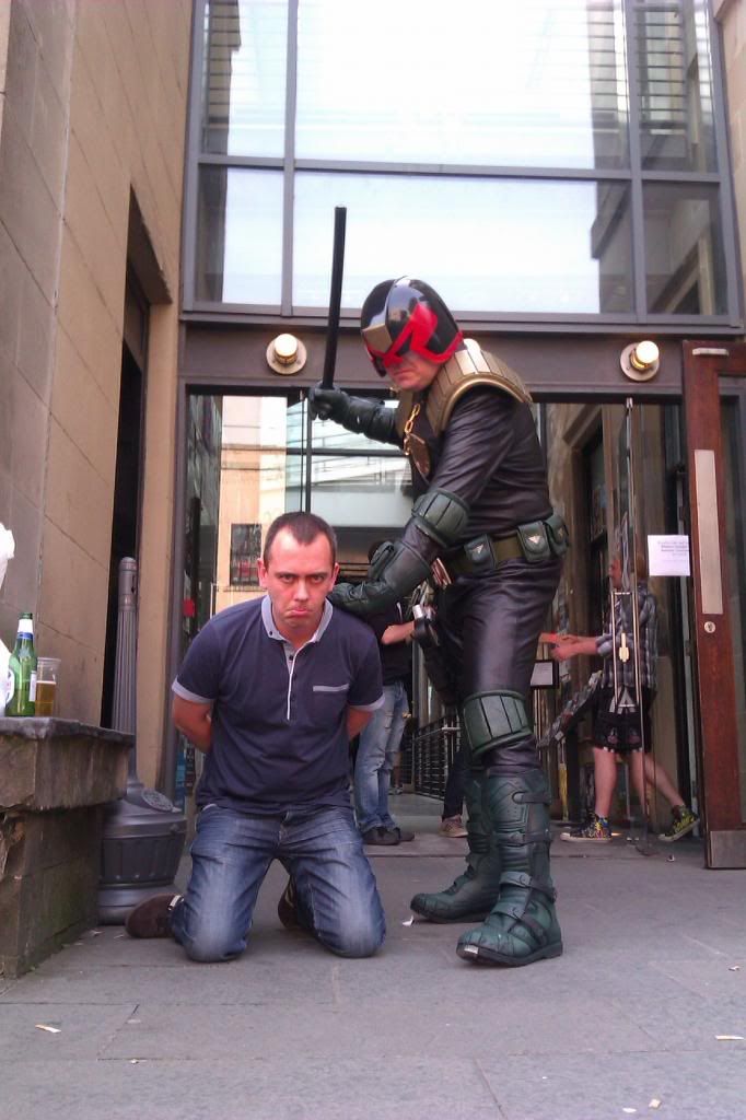 What a fantastic weekend! Fun and japes with Colin "Happy" MacShrapnel; John Wagner giving me his notes from his talk on writing (swoon!); Simon Bisley giving me or not giving me the evils all night and me not knowing who he was or why he kept staring at me; presenting Iz and the Whittle with a ceremonial dangly carrot and not receiving a black eye for it (although my stones are still throbbing); spending an illicit night surrounded by Wells' and Gronk's disconcerting apparatus; being charged with the location and procurement of something called "A Hot Scotch Pie and Tattie Scones" for a personage of some considerable eminence; meeting George Coleman, the artist who 'popped my cherry', so to speak, in FutureQuake; discovering that the hairy thing covered in twigs and sleeping in the park was actually my editor (a pleasure to meet you, Rich!); sharing cigarettes on a sun-blistered kerbside with Colin MacNeil and Dog Deever (bloody lovely chaps both); managing (at last!) to restrain myself from going on about the bloody bankers and the knackered but easily fixable fiat currency system every five minutes (although I may have mentioned it here and there); getting a lovely sketch (with a lovely personal inscription) from Carlos; meeting all you lovely people and finding that absolutely none of you pose any kind of threat whatsoever and are what we in my village call 'gradely folk'; only just realising as I write this that the lass in the flowery dress and the purple boots was probably Judo (d'oh!) - belated hi!; getting drunk; sharing a big lump of breakfast grease with bits of meat, eggs and vegetables in it with Pete Wells, Gronk and Richmond Clements and then having George Coleman and the Cosh (who is a proper gentleman and makes me wish I had a forelock) turn up to help; (possibly) narrowly avoiding being picked up by two men with (possibly) nefarious designs on my fundament; being accused of enjoying illicit and inappropriate (not to mention highly improbable) relations of an intimate nature with David Cameron and being advised to return to the land whence I came by a beggar who, having not taken no for an answer, insisted on singing at me as I tried to sneak a cigarette outside a bar; being mistaken for Colin MacNeil; seeing Colin MacNeil being mistaken for me; chatting with Alan Grant and hiding the fact that I had no knowledge whatever of the topic under discussion (The Bogie Man); watching the panicked locals scatter before an assembled throng of hardy cosplayers as our nearest star tried its best to burn every living thing to a quivering, sweating, crisp (those guys really are heroes - they must have been roasting, which might explain the smell - but I'm told that was probably just the 27 local branches of Greggs); having such a great time with all the peeps I met that I missed just about everything and only discovered the presence of Alan Davis by reading the posts immediately prior to this one and, Grud, so many other cool moments!