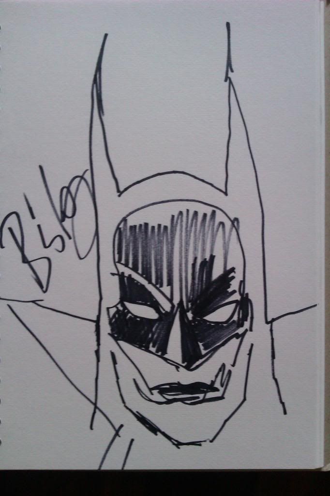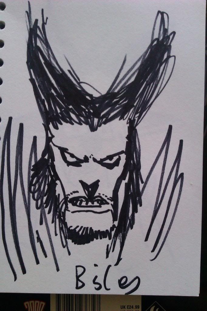I am a bit of a newbie to the boards, looking at the everything comes back to 2000ad page I realised I was talking to Pete Wells and Rob Stewart in the Wagner/Carlos que. Rob very kindly gave me a sheet of paper from his sketchpad so I could get a sketch off king Carlos. :D John Wagner seemed a very nice , down to earth bloke as did Carlos. I spent two blistering hot hours in a que to meet Simon Bisley he was a bit stand offish at first but had a good chat with him. Spent my money on a Dredd/Alpha print and a selection of american Dredd reprints which are like gold dust in the North East.