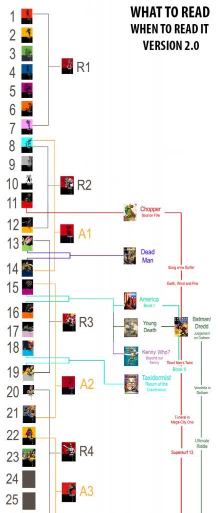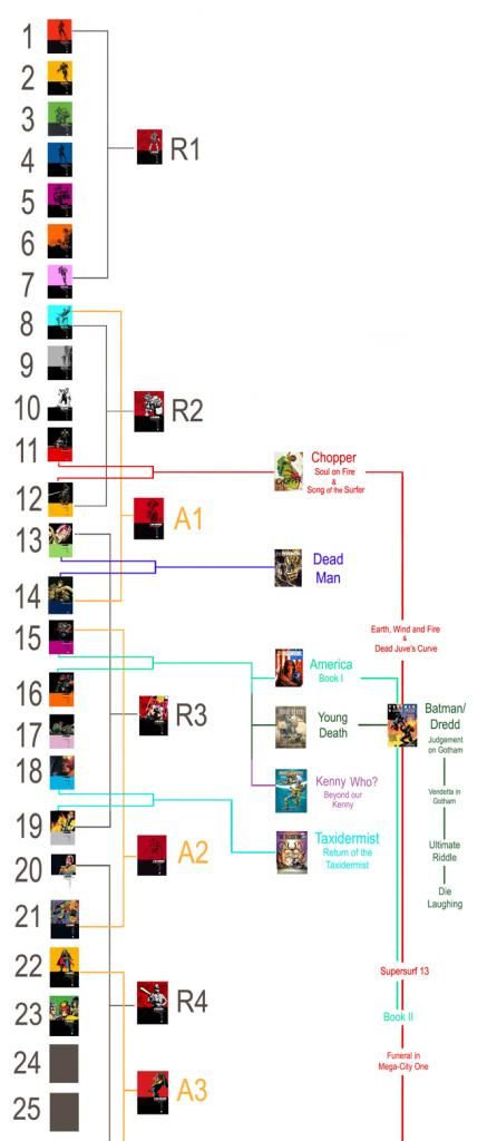 as i wait for my copy of DOC: fallout to arrive i was wondering if someone could help me sort the Dredd rebellions in order as i have messed mine up and i fancied reading them from the start again. Obviously I'd leave the artist collections out but if anyone could help that would be great.