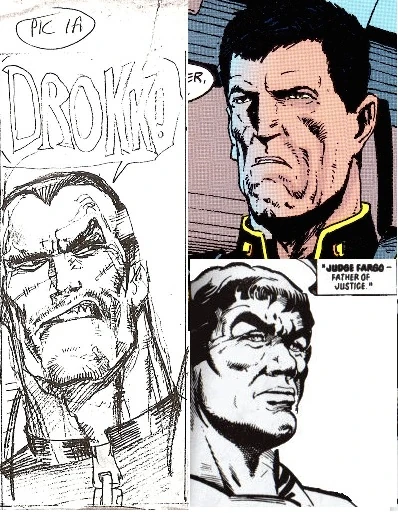 Dredd's face? Well, I always wondered, considering he and Rico are clones, wouldn't be if he looks like Rico? If it means anything, Dredd's blondie (as briefly shown in Day the Law Died).