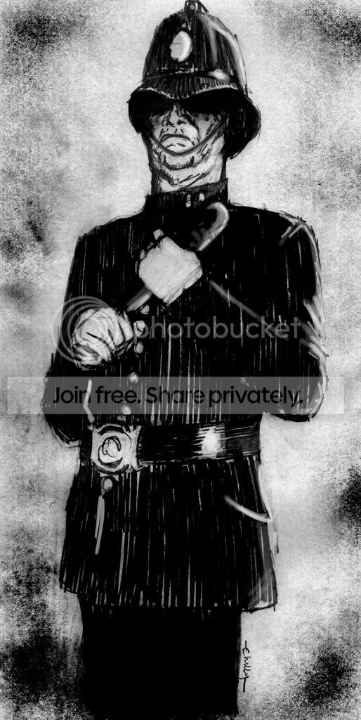 Steampunk Dredd? Could be a new story Arc one of those alternative history malarkies. Your 1900 Dredd looks suitably tough for the mean streets of London and the splats of ink lend a foggy background. Great idea.