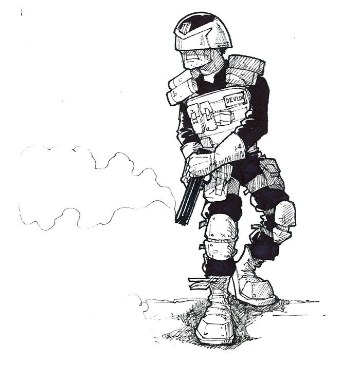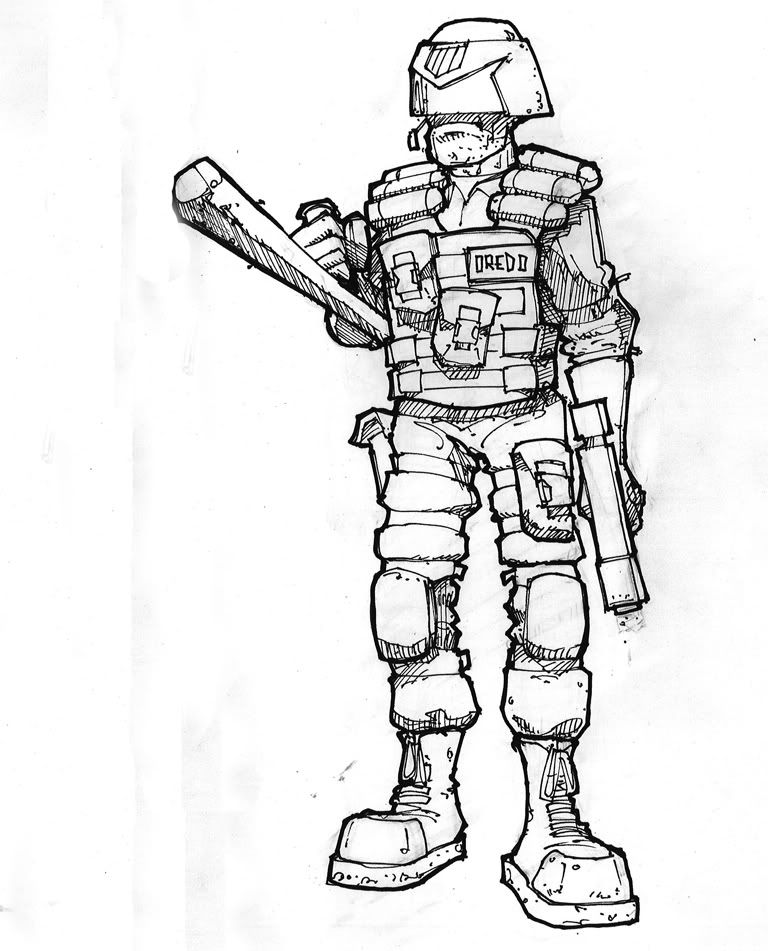 Some nice art skills there. Particularly like the heavily shaded images on the last pic. It's a nice, if a little generic, uniform. For an 'alternate universe' Dredd, this would be cool. Not to replace the current look though.