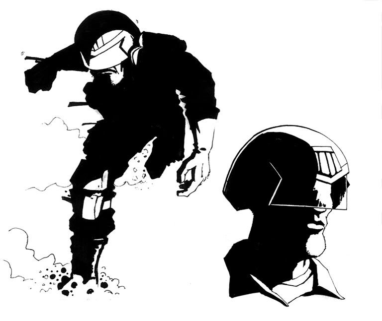 First an admission: CaptainRhodes has badgered me for months to post these. They're from a small personal project I'm doing. There are several things about the Dredd universe that have bothered me over the years. In an attempt to reconcile these issues I've inadvertently written what amounts to a Judge Dredd Reboot. I guess it's a kind of Judge Dredd Elseworld in which he looks a little bit different and operates in a city that doesn't resemble the Mega City One in the comics. The Dredd from this Elseworld is still a grim-faced thug but he's more complicated and has a deeper and more interesting relationship with his clone-brother Rico (Who's still free, incidently). Actually, in my Reboot Dredd is still in the cloning tanks. It takes place in the transition period from cops to judges.