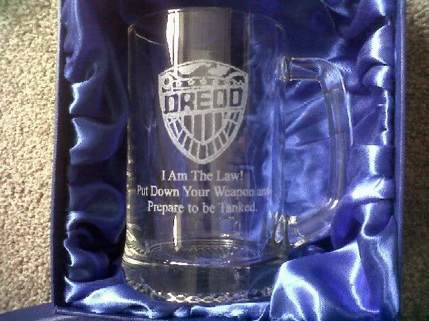 She had it custom engraved for me. In case you can't read the text, it says, "I Am The Law! Put Down Your Weapon and Prepare to be Tanked!"