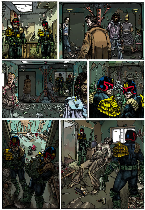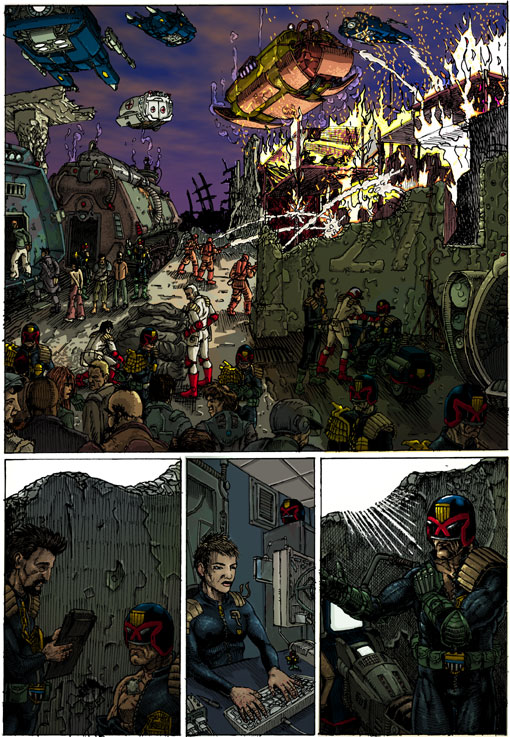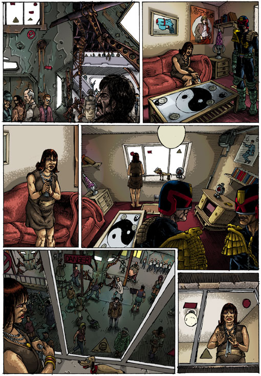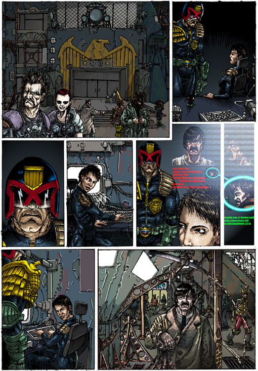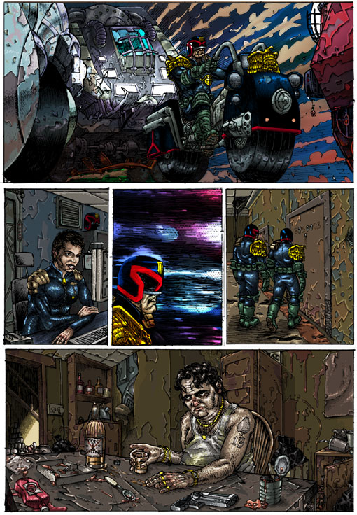 I was just poking about on my old websites and I found this embarrassing yet strangely charming Judge Dredd strip I drew about 8 or 9 years ago. Both my drawing and my colouring have moved along quite a lot since then and I'm man enough to show my less then perfect passed work! (if I waited for my work to be perfect I would never show any one anything.)