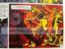 I think the main point being made is that while all those scenes and images are fairly faithfully reproduced visually, the manner in which they are handled in the film is worlds apart - the Big Figure toilet scene being a case in point.  in the book, the masked heroes (with the exception of Jon and Adrian) are just faintly ridiculous people who can handle themselves in a fight, in the film they are all Neo on a homicidal rampage.   As Jim mentioned earlier, you just have to contrast the alley fight with the one in the book: two cold superhuman killers having a workout, versus two out-of-practice people getting hot and sweaty seeing off some punks, the narrative point of which is not that they are frackin' kewl pwners, but rather to highlight a shared physical experience that foreshadows the odd nature of their sexual relationship.
