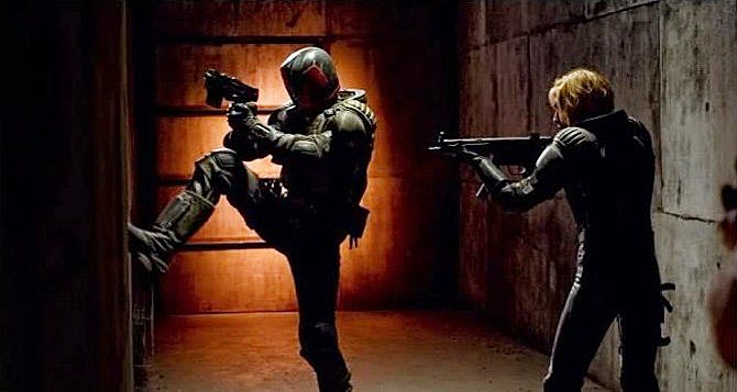 This shot of Anderson makes it difficult for any sweaty shrimper to get particularly excited about what appear to be a pair of flat-soled monkey boots with added shinguards: http://youbentmywookie.com/wookie/gallery/0212_entertainment/dredd4.jpg