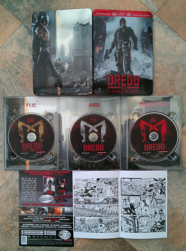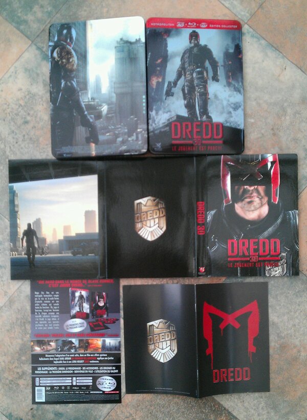My Metropolitan Dredd box set just arrived - sadly the metal tin is rather bashed up and quite badly dented on front and back (hopefully a bit of gentle hammering will go some way to restoring it), and though I got the booklet - which is really just an ad for the French 'Integrale' (Case Files) and is itself tainted by an ad for that STALLONE bloke's new flop - it doesn't have the character descriptions in the the booklet in the earlier picture, which is odd.