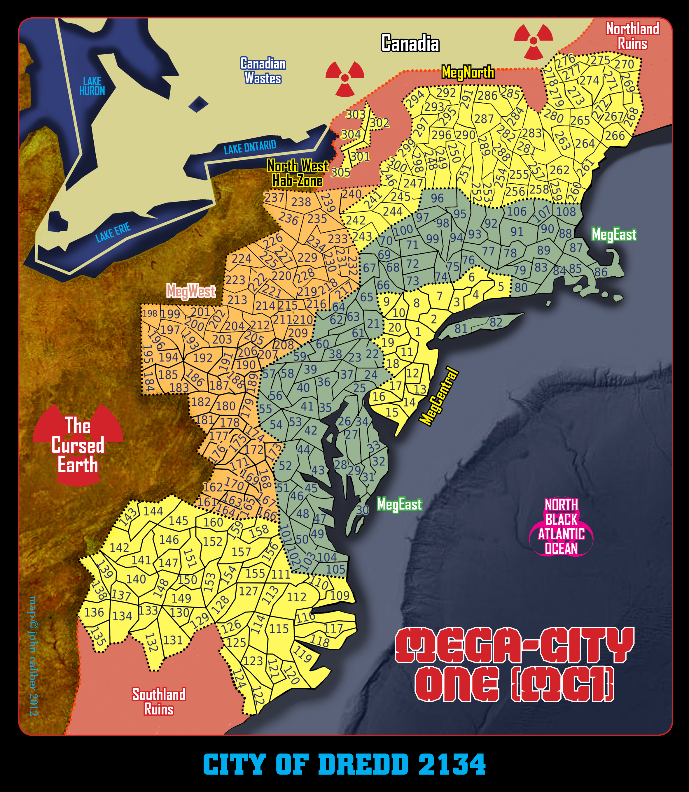 Mimikeke, I've mapped the map on the thread image pretty carefuly over a blank outline map of SE Canada and NE USA. I have smoothed off some costal features based on some global sea rise figures I looked at. Thus the spar at the top of long island (the finger is gone); further down the coast from Delaware/Maryland to North Carolina I have lost thousands of sq km in the low lying areas around the Sasquehana river/Chesapeake bay all the way down into the North Carolina costal low lands. The maps shape also shows the smoothing/utilitarian effect of the west wall/Atalantic walls. The central sector layout is taken from the Bobs law map in prog 355 the only map 2000ad have printed with the Big Megs layout done in detail, and it seems a pretty rational job. I haven't seen Johns map yet so I don't know what amount of licence he has used in his visulation of the city layout. Z